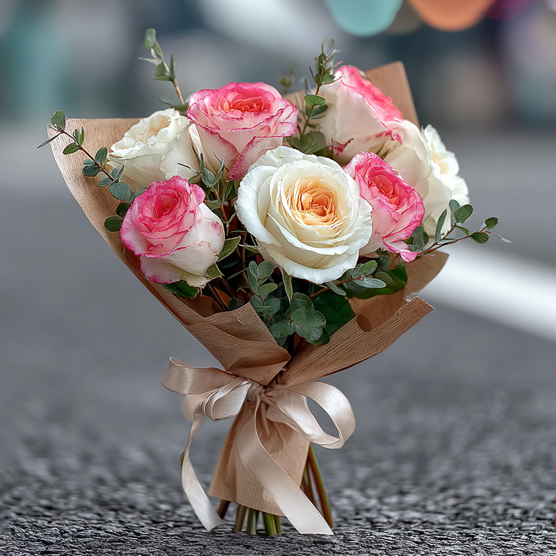 This bouquet is a dream left behind by spring. The pink-to-white gradient roses bloom like clouds kissed by the morning glow, their petals flushed with gentleness. Champagne roses shimmer like crushed golden light, hiding the warmth of the sun. Eucalyptus leaves add a hint of fresh green, while kraft paper wraps the overflowing fragrance, tied softly with a pale gold ribbon. Nestled together, these blooms weave the tenderness of spring and the sweetness of flowers into one fragrant embrace — as if an entire bright morning had been gathered into a bouquet. To see it is to hold a piece of sunlight that dances on your fingertips, leaving behind the taste of sweetness.